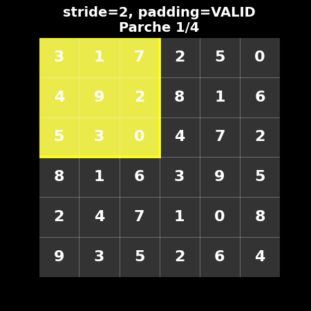 Ahora desplazamos el kernel una columna a la derecha. La nueva ventana es: \( W_2 = \begin{bmatrix} 1 & 7 & 2 \\ 9 & 2 & 8 \\ 3 & 0 & 4 \end{bmatrix} \)