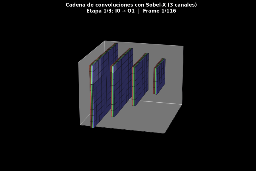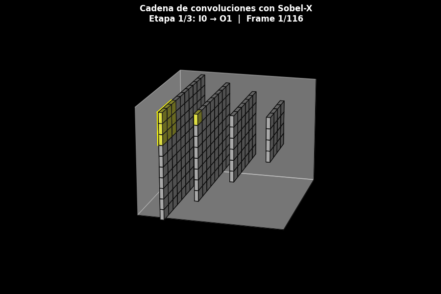 A partir de la segunda capa convolucional en adelante, los filtros ya no se aplican sobre una imagen, sino sobre el conjunto completo de mapas de activación producido por la capa anterior, generando nuevos mapas de activación.
