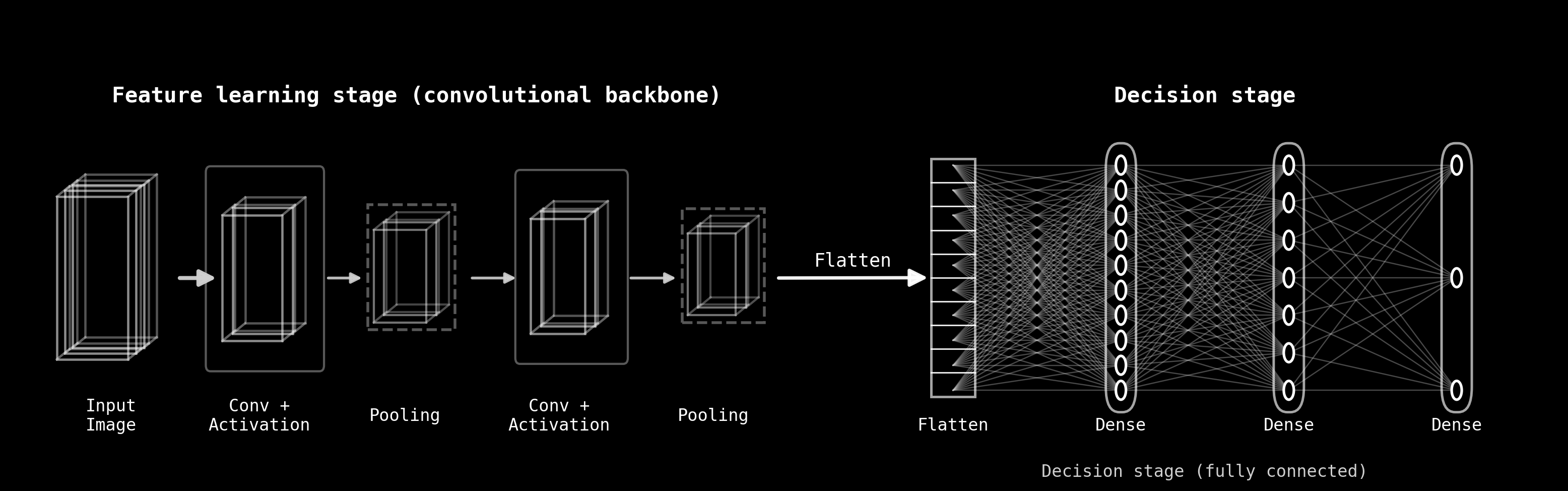 La segunda etapa, denominada decision stage o fully connected stage, toma las representaciones aprendidas y las transforma en una decisión final, como una clase, una probabilidad o una predicción numérica. Para ello, los mapas de características generados por el backbone se reorganizan mediante la operación de flatten y se procesan con capas densamente conectadas, de forma análoga a una red neuronal tradicional.