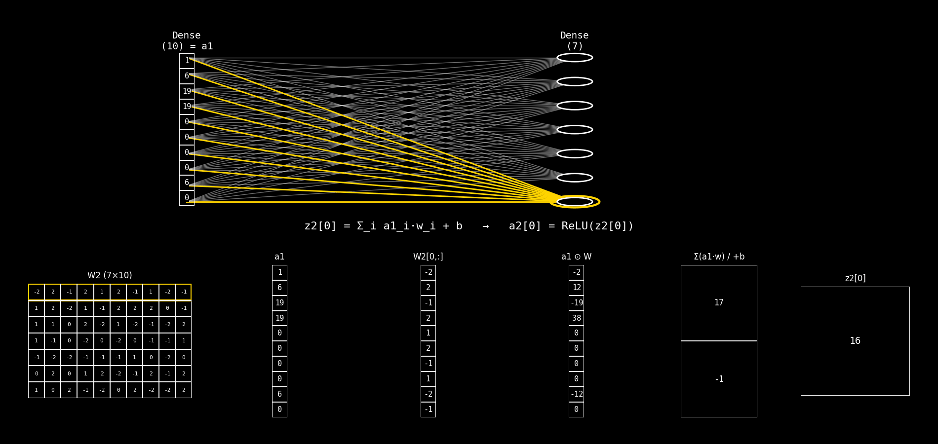 W1,b1,z1,x→W2,b2,z2,a1.La operación es la misma: producto elemento a elemento → suma → bias →