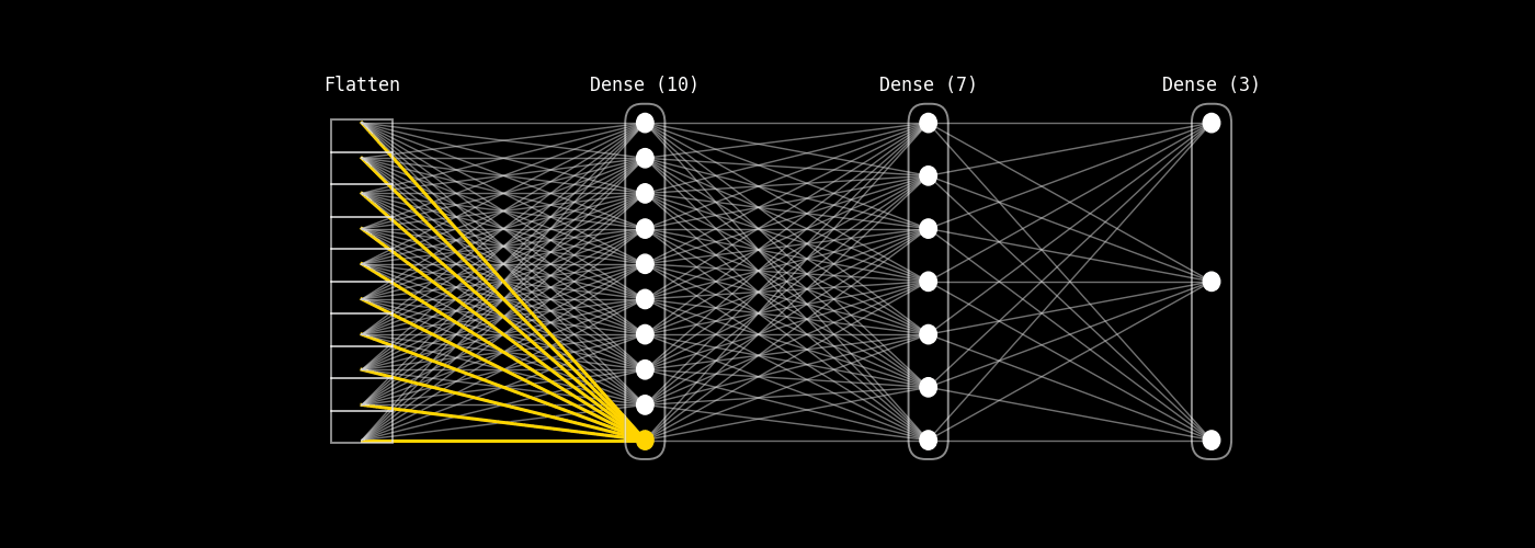 El ejemplo integrador presentado en la figura final siguiente muestra la acción completa de una capa fully connected como una secuencia coherente de transformaciones, en la que el vector de entrada es progresivamente procesado por capas densas sucesivas. A diferencia de los ejemplos anteriores, donde cada transición se analizó de forma aislada, esta visualización permite apreciar el comportamiento global del bloque fully connected: desde la recepción del vector aplanado (Flatten), pasando por la generación de representaciones intermedias en capas densas, hasta la obtención de un vector de salida de menor dimensión. El GIF sintetiza visualmente cómo cada capa aplica la misma operatoria básica —combinación lineal seguida de activación— pero sobre espacios vectoriales distintos, encadenando transformaciones que refinan la representación de la información.