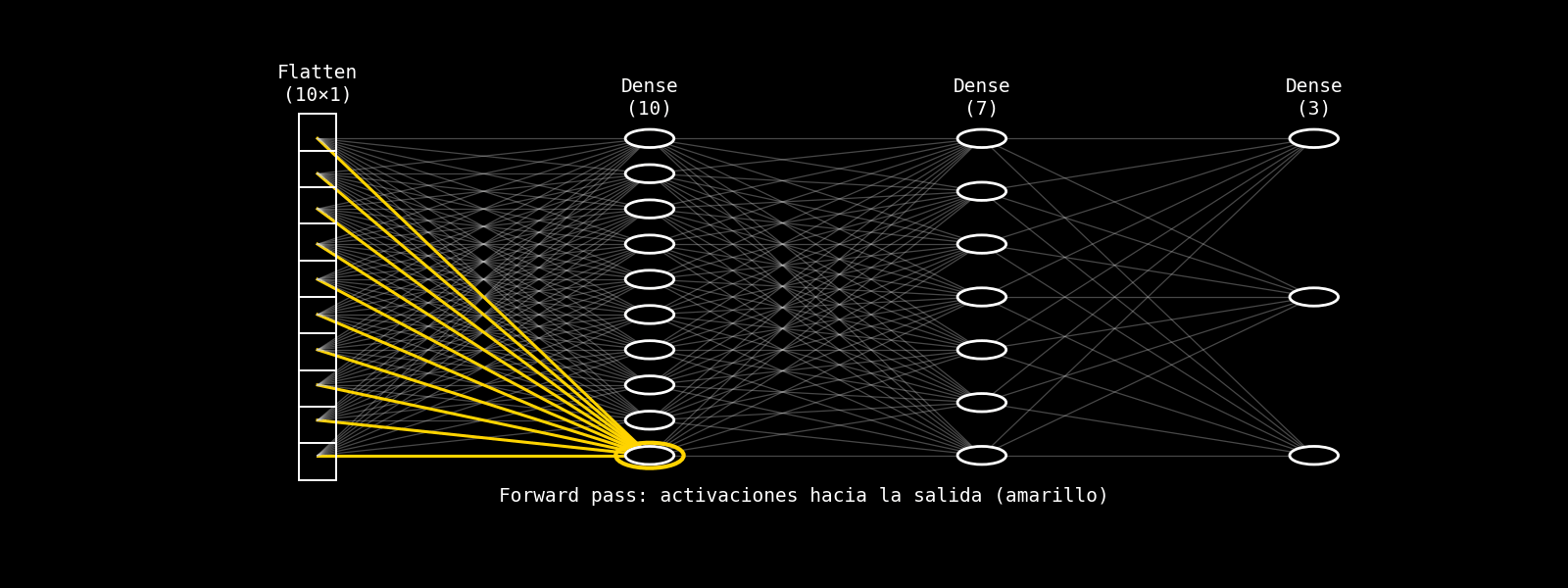 La siguiente animación ilustra la intuición de backpropagation en una fully connected: la predicción se produce en el forward pass (amarillo) y, luego, una señal de error retorna capa por capa (rojo) para guiar el ajuste de parámetros. La visualización es cualitativa: no muestra derivadas ni valores numéricos, sino el flujo conceptual de la corrección.