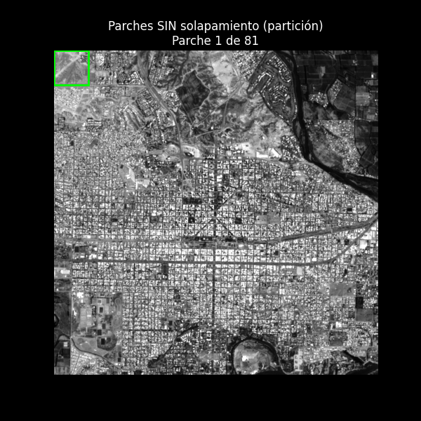 Un parche es simplemente un recorte rectangular de una imagen satelital o aérea. En lugar de procesar toda la escena de una sola vez, solemos dividirla en pequeños bloques, por ejemplo de 32×32 o 64×64 píxeles.